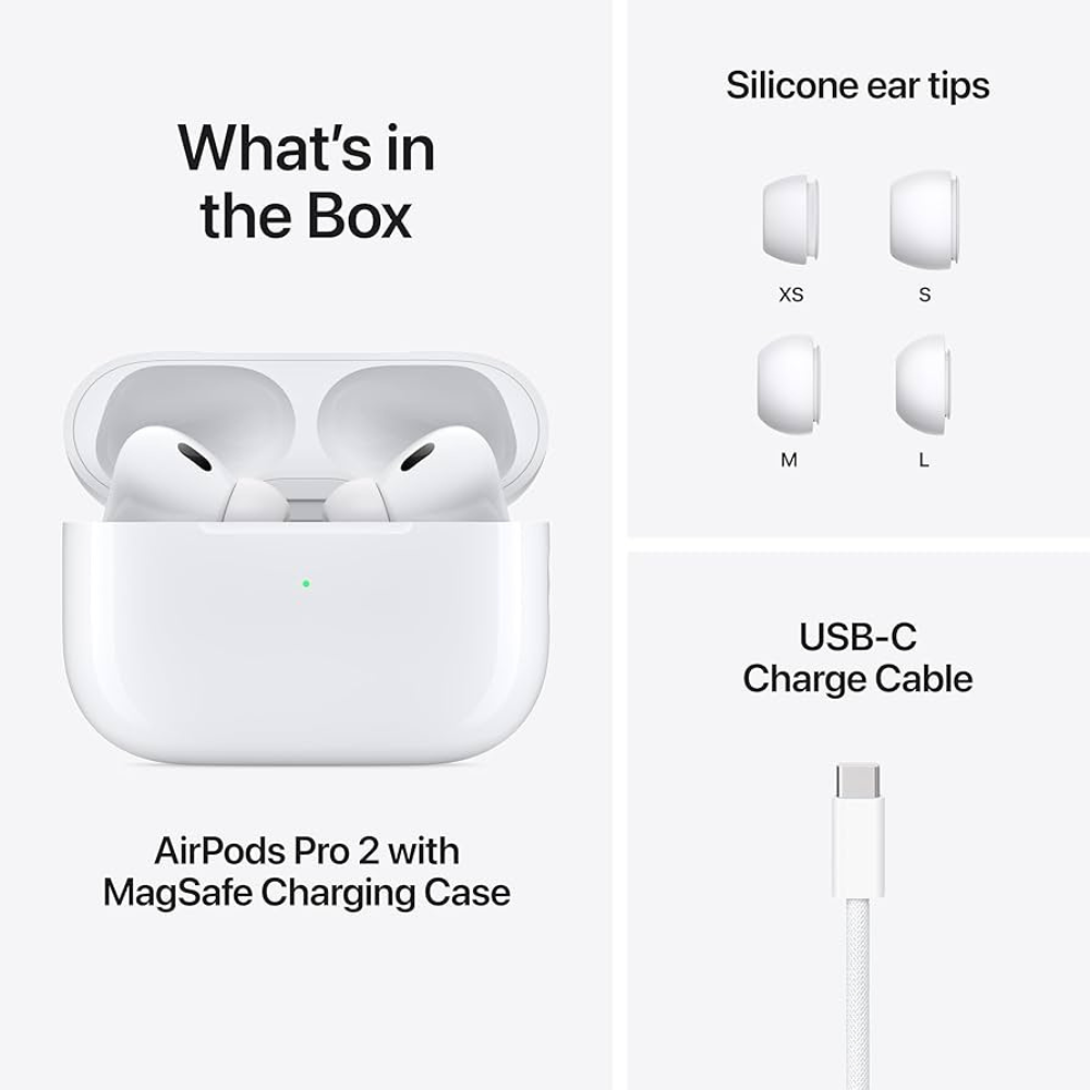 AirPods Pro 2nd Generation deliver clear, powerful sound with Active Noise Cancellation and Transparency Mode. Enjoy Spatial Audio, touch control, and a comfortable fit for music, calls, and gaming. Comes with a MagSafe charging case and long battery life for all-day use.